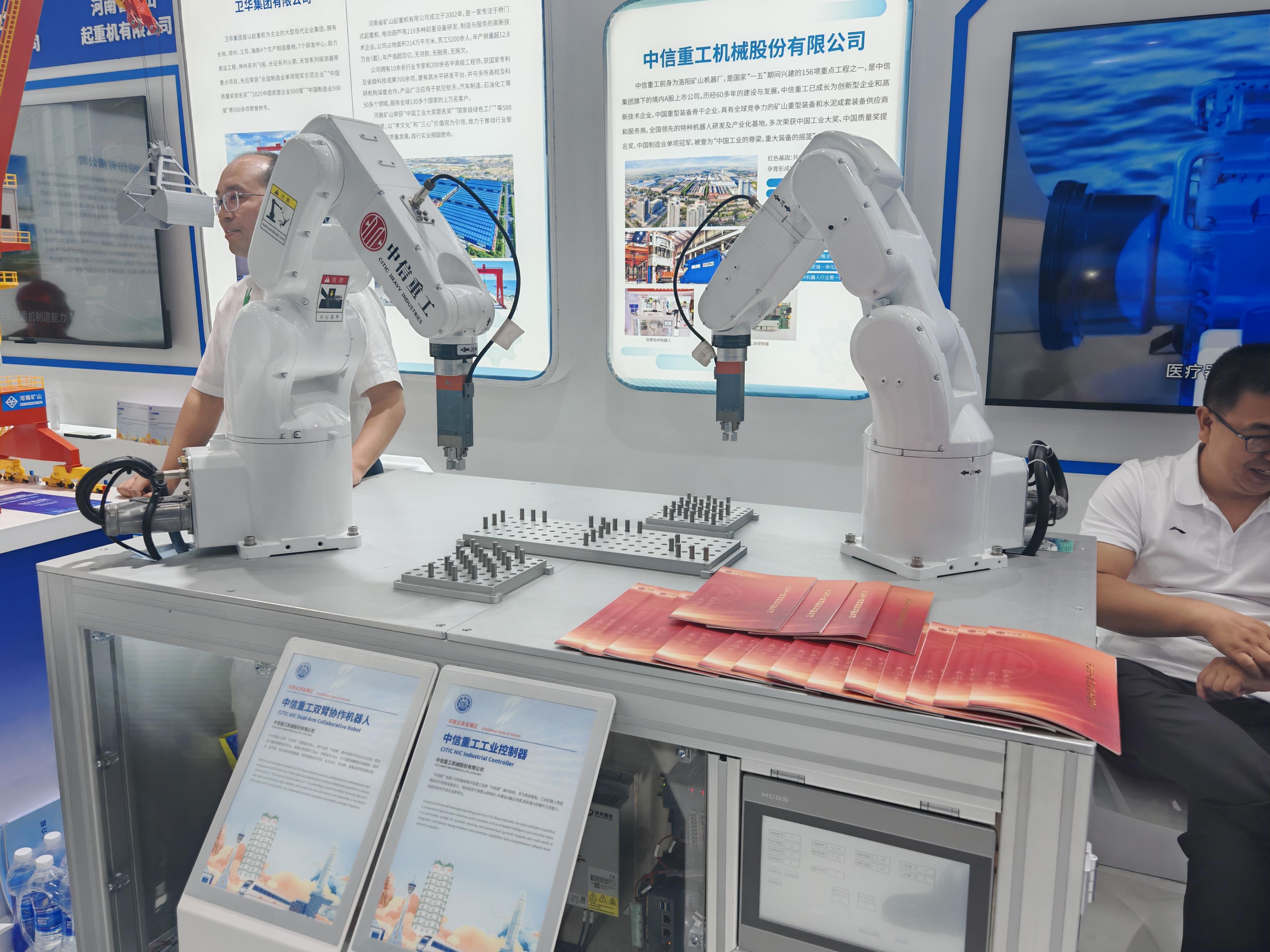 在河南展区中信重工展位上,中信重工打造的“工业机器人”——双臂协作机器人引人关注。只见两个机械臂正在精准夹取物料,耐心拼凑图形。不一会儿,机械臂就摆出了“CITIC”字样,这正是中信重工的英文简称,整套动作精准协调、节奏流畅。